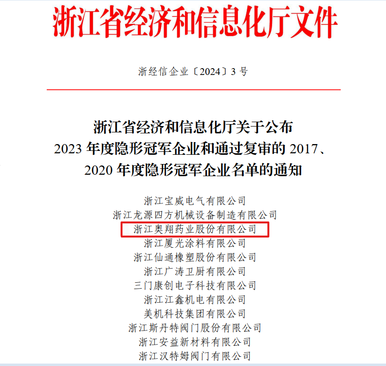喜訊!2024年1月9號收到浙江省經(jīng)濟和信息化廳文件通知,公司被認定為2023年度浙江省隱形冠軍企業(yè)。
